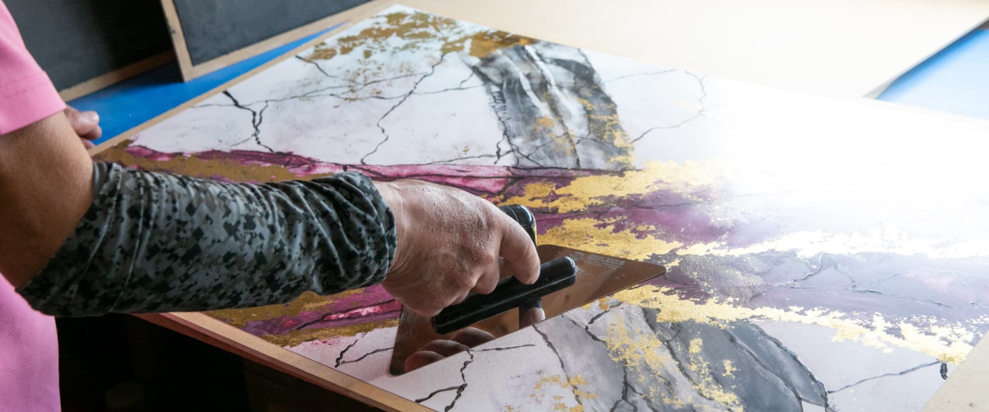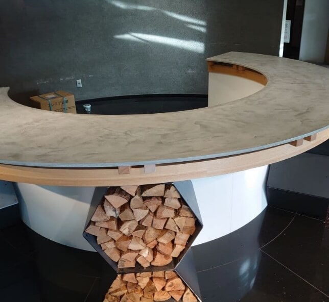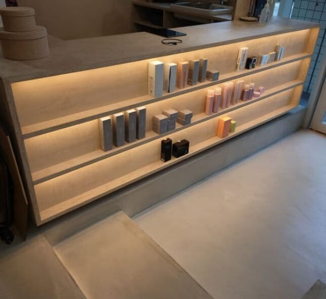モールテックスは、滑らかな石材や磨き上げられた素材感を、僅か3mm程度の厚さでシームレスに表現できる内装用特殊塗り材です。